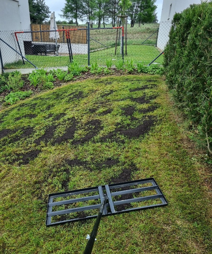 Na závěr byl zákazník informován o nutnosti pravidelné závlahy, aby byl substrát i osivo stále vlhké, což je zásadní podmínkou pro úspěšné vyklíčení nového trávníku a jeho následnou regeneraci.