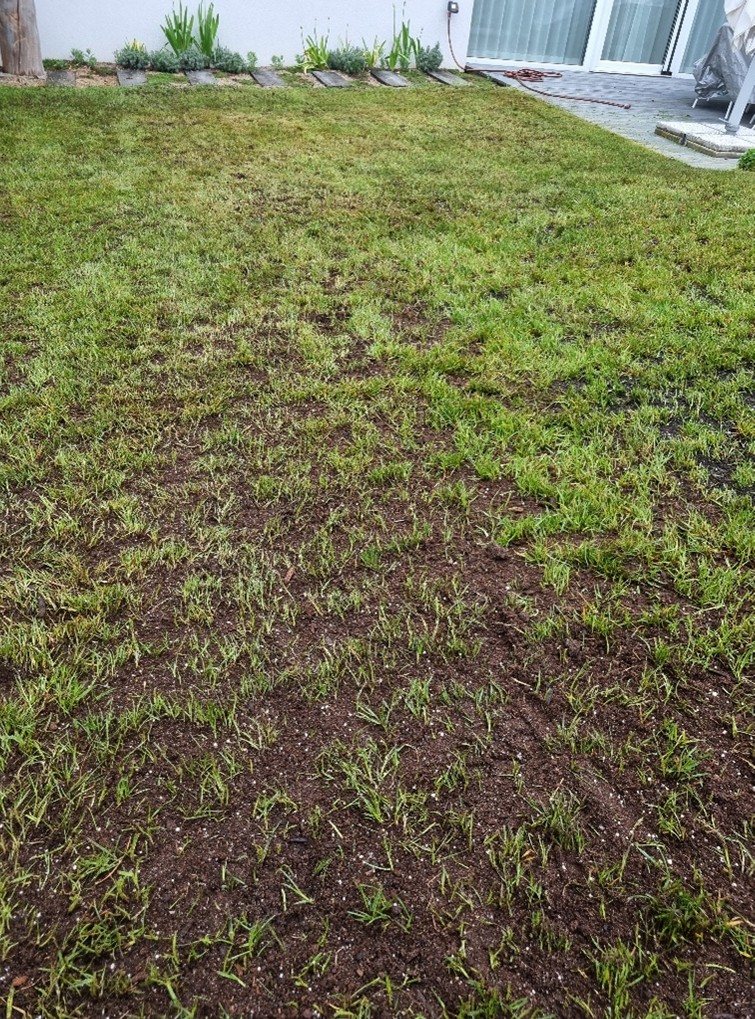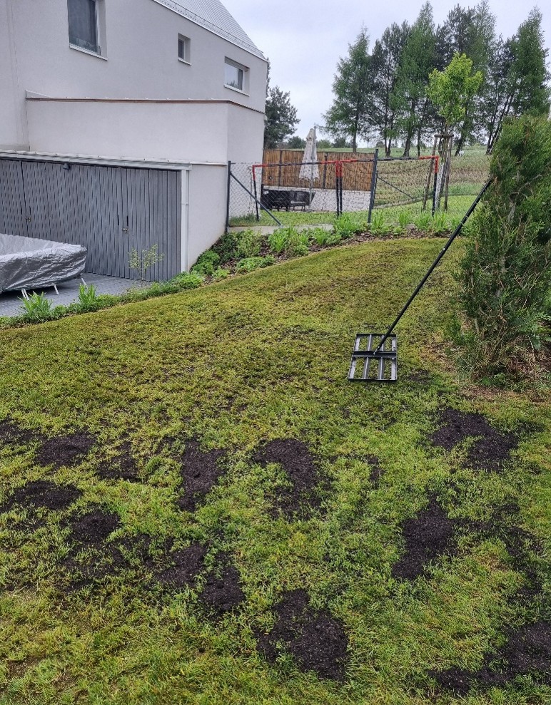 Dalším krokem byl celoplošný dosev kvalitní okrasné travní směsi, která zajistí postupné zahuštění trávníku a zlepšení jeho vzhledu.